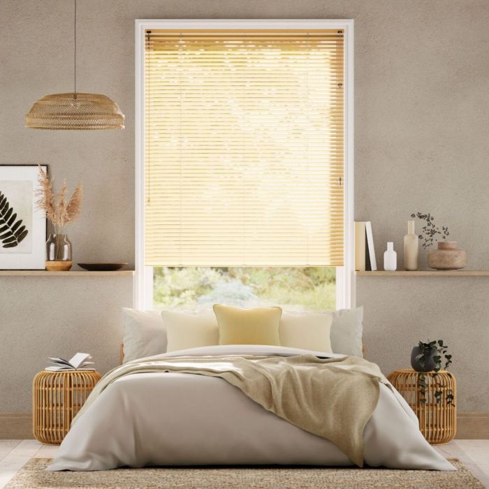 Our gold venetian blind will make a precious addition to your design scheme. The soft black shade features added hint of luxury. Team your new window dressing with coordinated accessories for a sophisticated impression. Venetians come with matching head and bottom rails and provide fingertip control over sunlight and privacy. Simply tilt the slats to let light in while keeping prying eyes out. Or raise them completely for a clear view of the outside world.