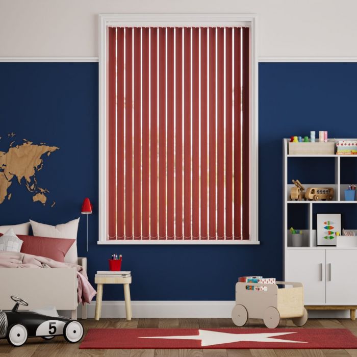 This classic blackout Maroon Red color affords complete privacy and total light control and is supplied with our new robust metal brackets system. Blackout Maroon Red is a tasteful and chic addition to any interior. This Maroon Red vertical blind is perfect for making any home or office appear sophisticated and elegant; being a blackout blind it offers the utmost privacy, as well as being incredibly effective at stopping the sunlight from entering through the window when closed.