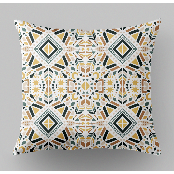 *Design: Double-sided print featuring a retro-inspired geometric mandala design paired with minimalist triangle patterns in earthy tones. Comes with an invisible zipper that closes and opens smoothly for a seamless look.