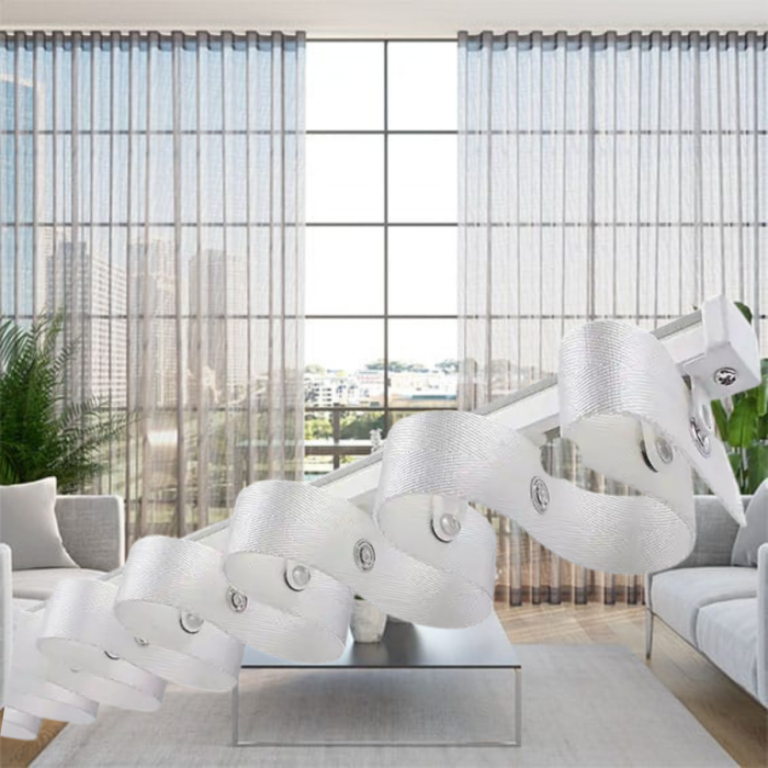 The set includes the track, ripple fold tape, runners with rope, connectors, end caps and fixing brackets.